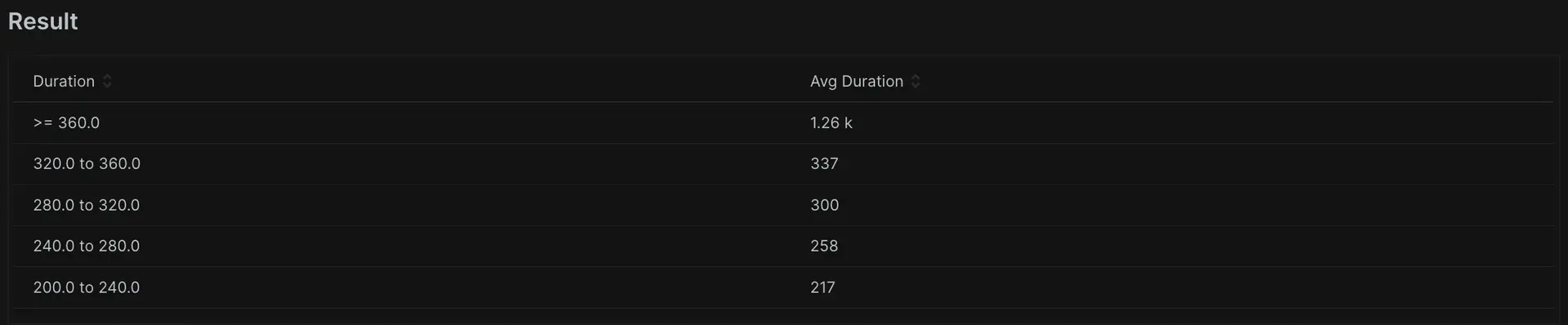 databaseCallCount, set the ceiling at 400 calls, and group it in 10 buckets. This results in the performance of transactions making 0-40, 40-80, 80-120, 120-160, 160-200, 200-240, 240-280, 280-320, 320-360, and >360 Database Calls. 10 clear buckets divided evenly up to the ceiling.SELECT average(duration)FROM TransactionSINCE 12 hours agoFACET buckets(databaseCallCount, 400, 10)