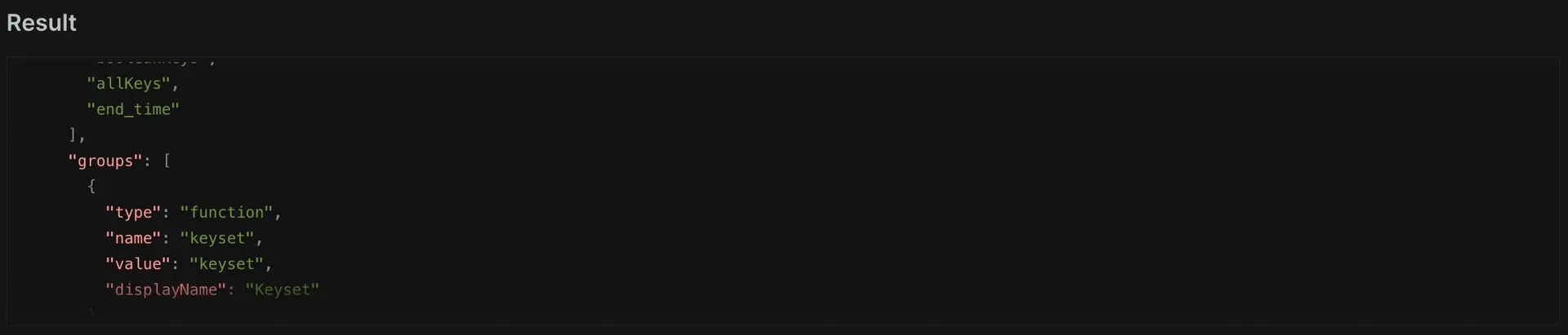You may need to know what attributes you have available for a given event type. The keyset() function provides a list of all attributes for an event type, grouped by attribute type. You'll only get attributes that contain values within the provided time window, which you can use to explore your data. You can also use it in automation, for things like ensuring customer data reports correctly.