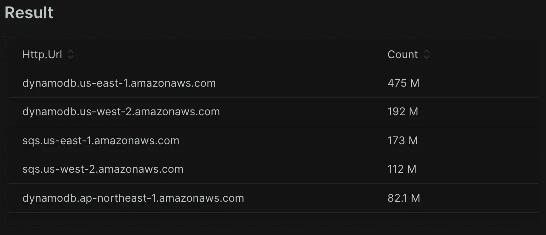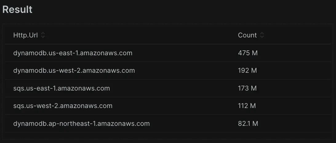 In our sample query, you can get the number of transactions with the term "amazonaws" anywhere (beginning, middle or end) in the name.