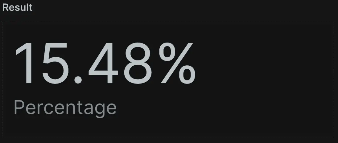 You may find that you need percentages instead of counts, sums, or averages. Using the percentage() function allows you to calculate the percentage of a value in the data set that matches a specified condition. This function takes two arguments: the first is an aggregator function for your desired attribute, such as count(). The second is a WHERE condition to specify the subset of data you'd like to query.